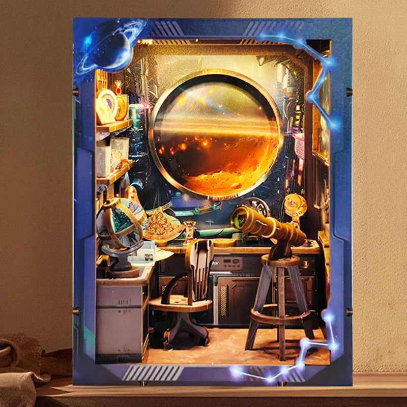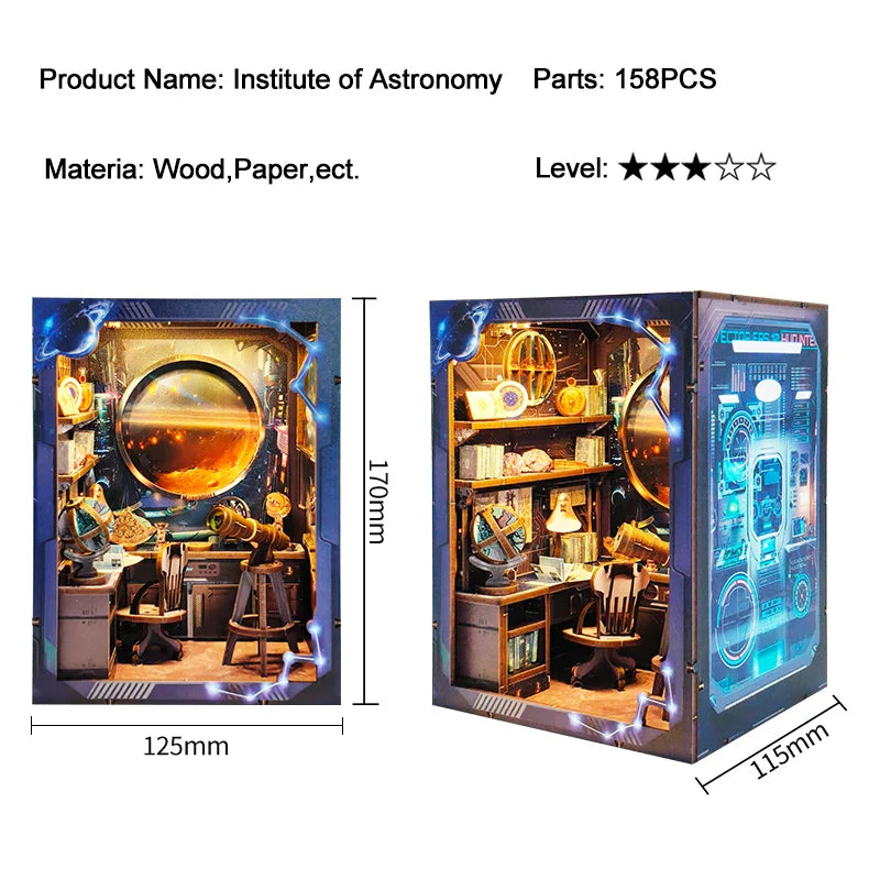 Explore the stars from your bookshelf with this DIY Wooden Book Nook featuring the Institute of Astronomy — a beautifully detailed miniature model kit with lights, perfect as a creative gift for space lovers and dreamers.