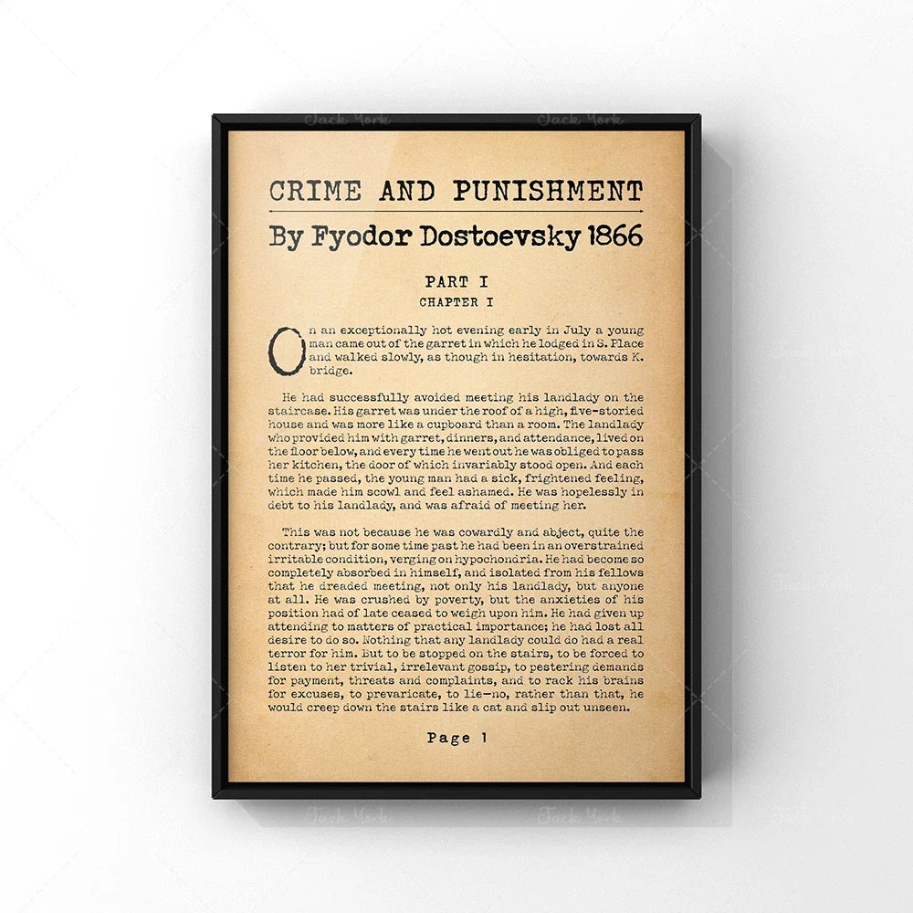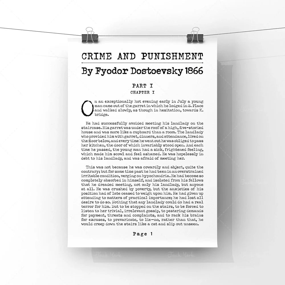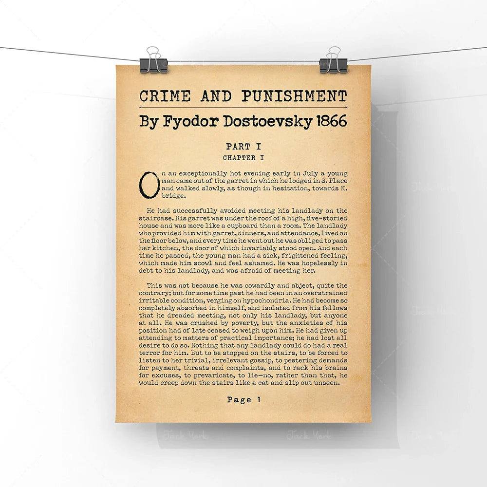 Showcase the intensity of a literary masterpiece with this minimalist poster featuring the iconic first page of Crime and Punishment. A must-have for fans of classic Russian literature and psychological fiction.