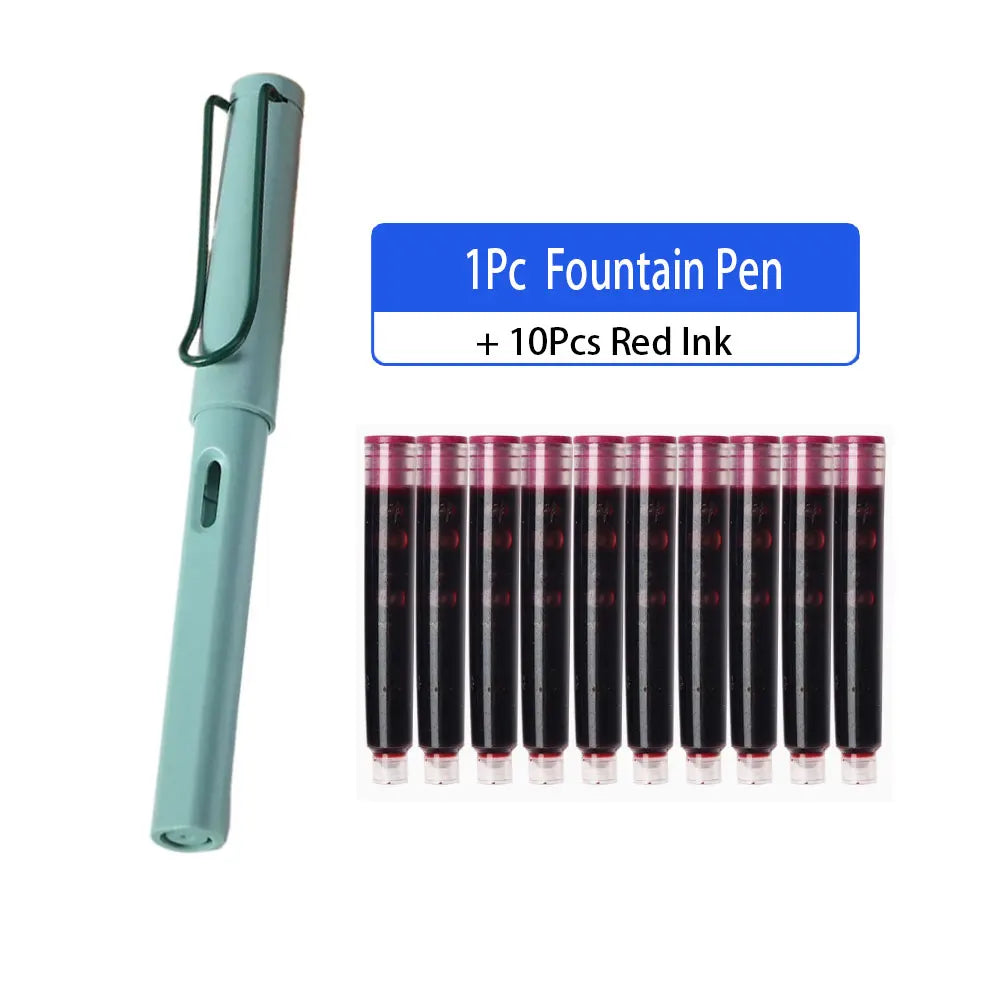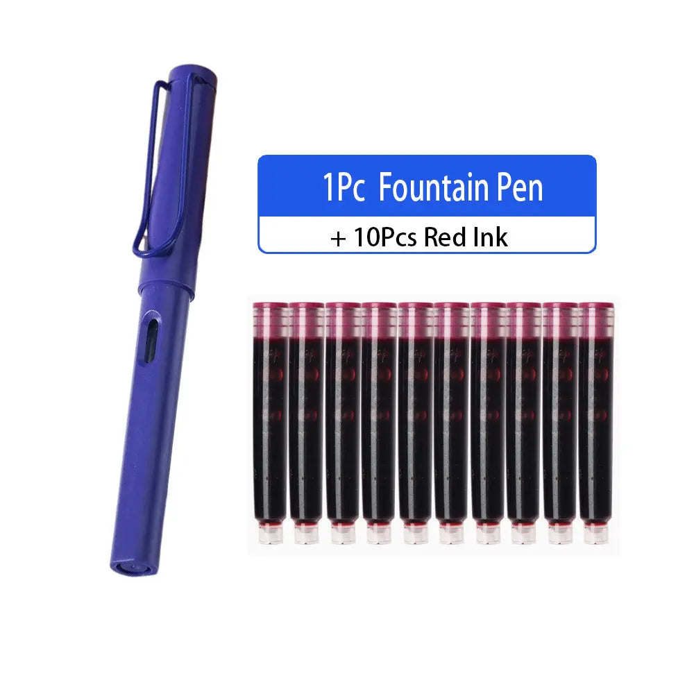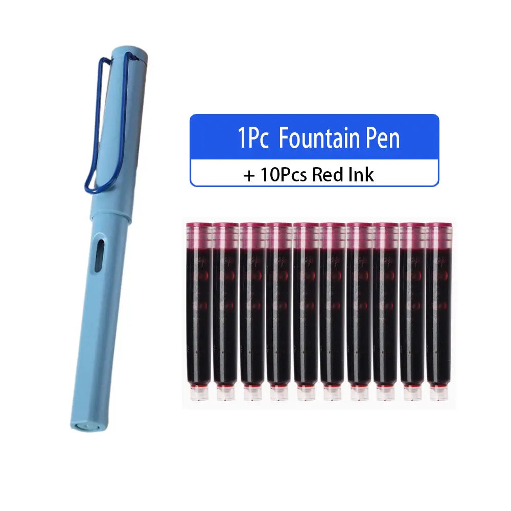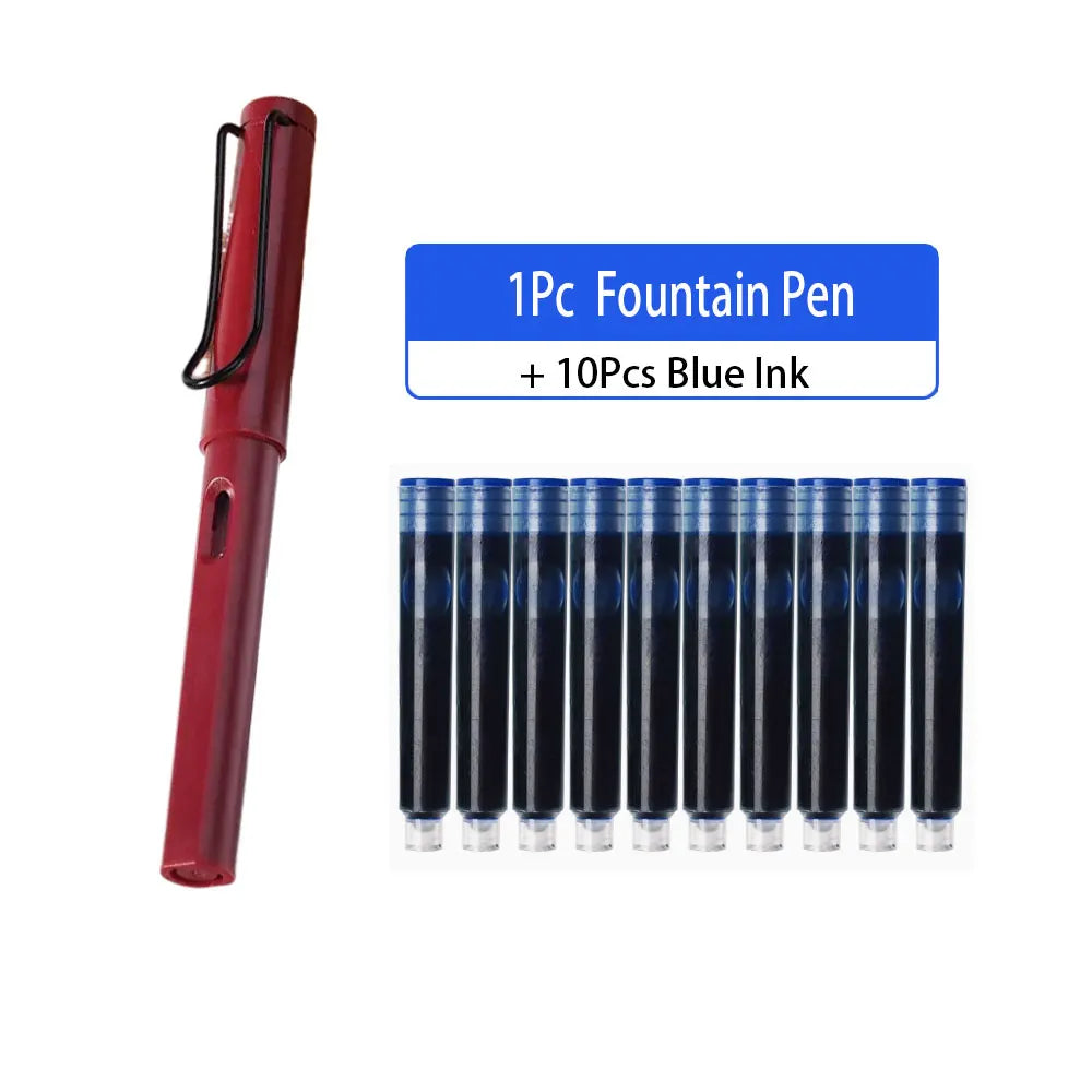 High-Quality Inking Pens Set – 1 Fountain Pen + 10 Ink Refills (Black/Blue/Red)
