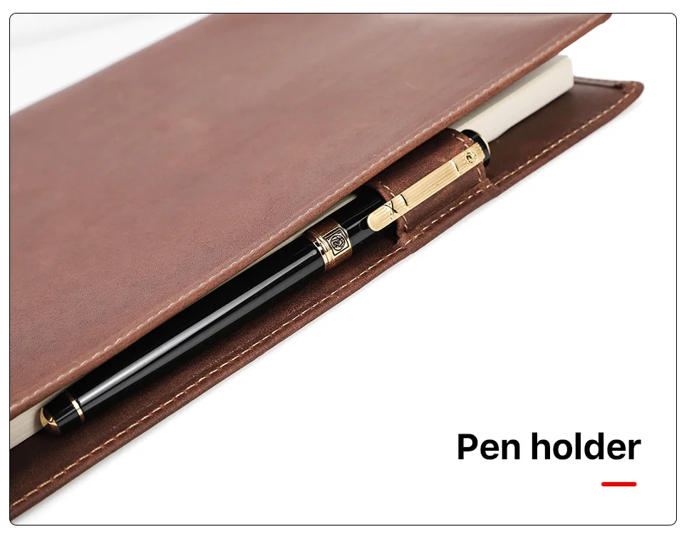 Add timeless elegance to your writing essentials with this retro-style genuine leather book cover, complete with a pen holder and sleeve design — ideal for students, professionals, and journal lovers.