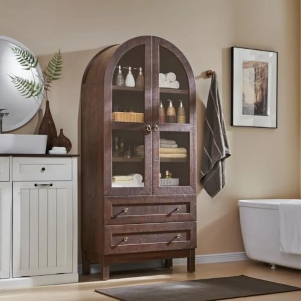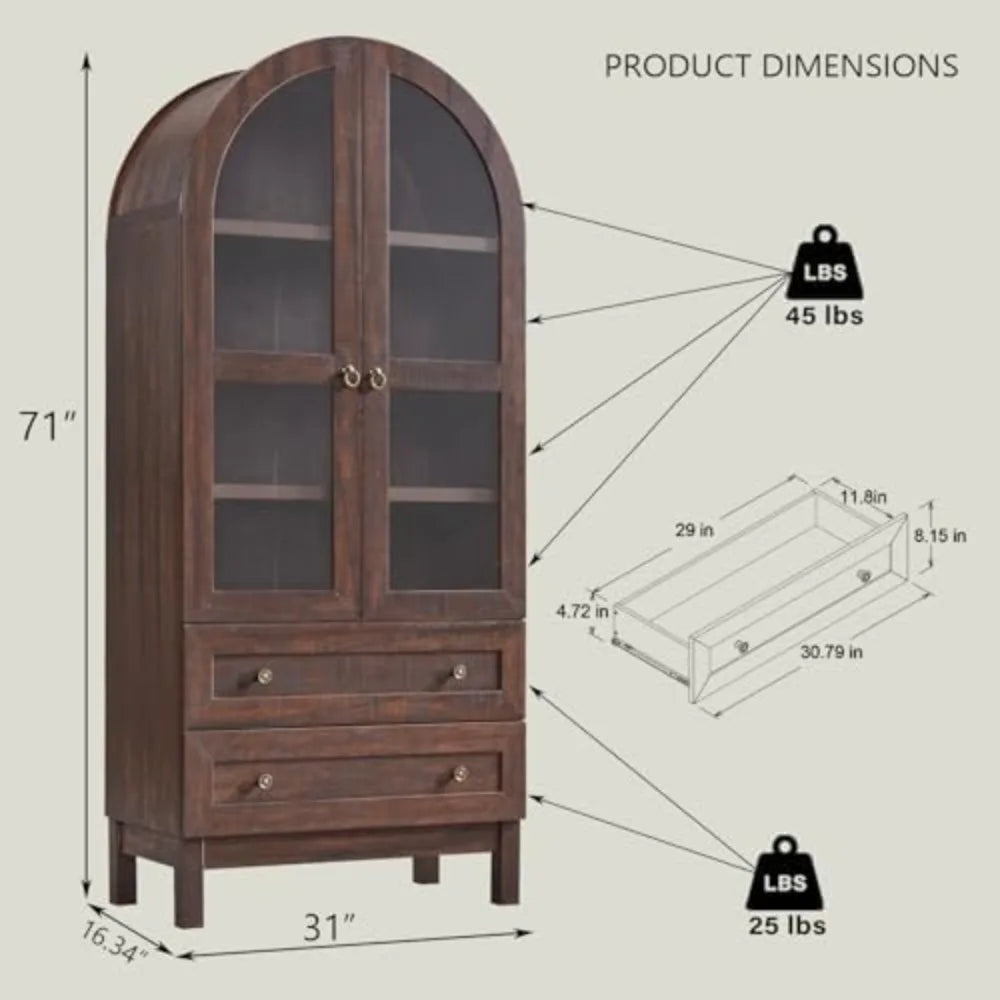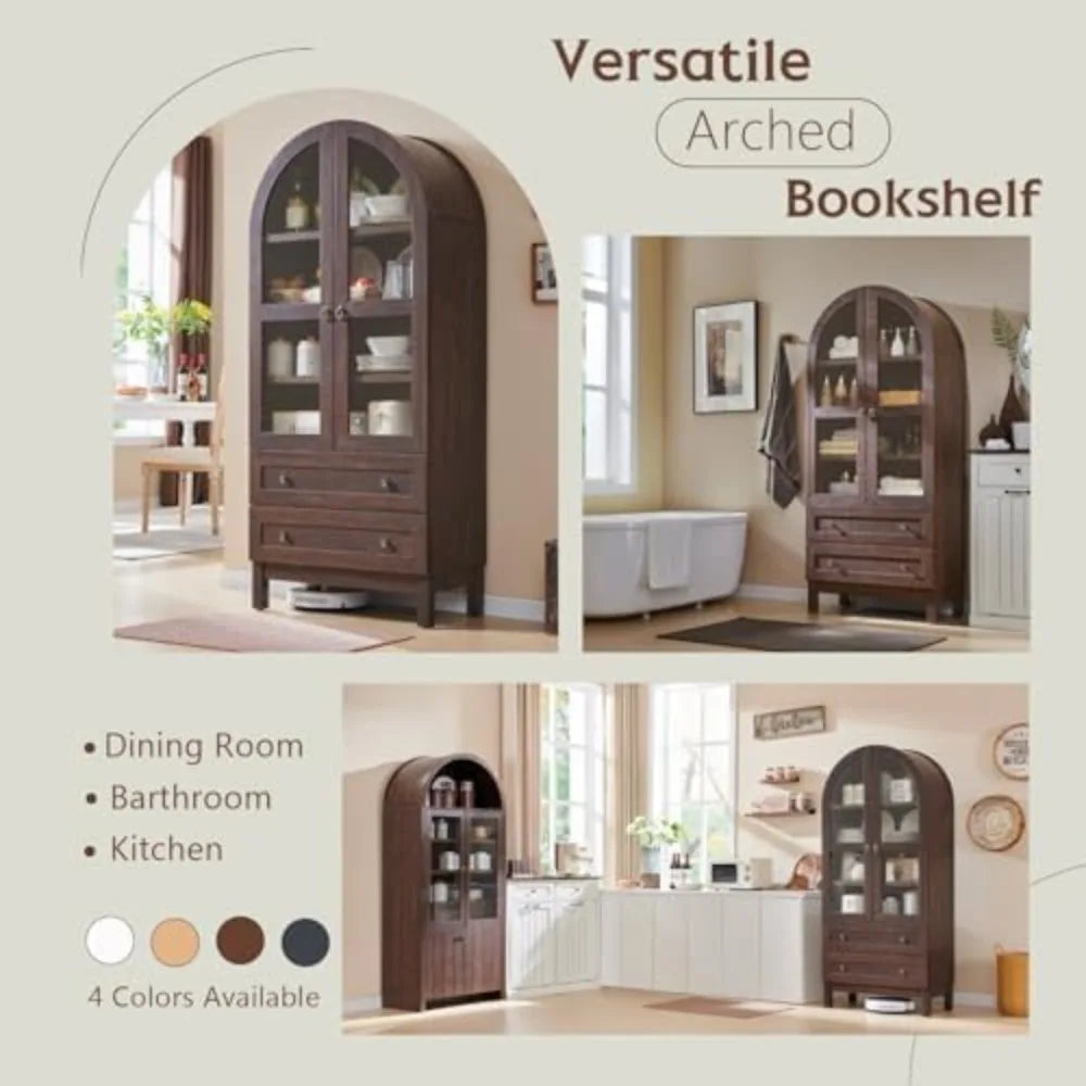 Add timeless elegance and smart storage to your home with this 71" tall arched bookshelf, featuring 4 open shelves, glass doors, and 2 spacious drawers — a perfect fusion of modern style and classic charm.
