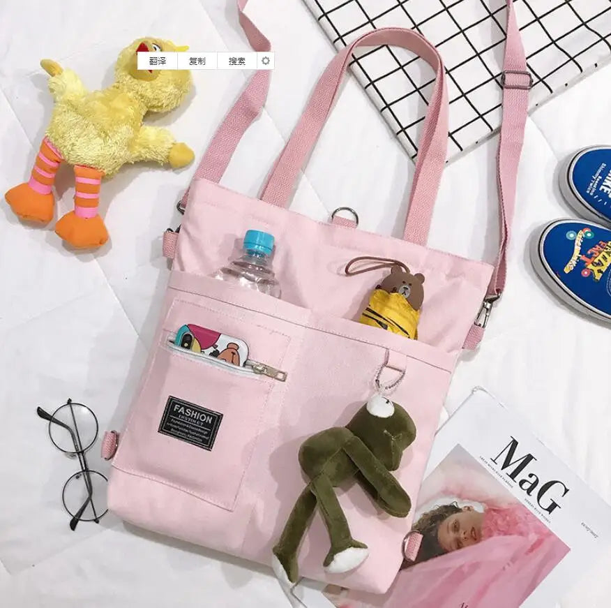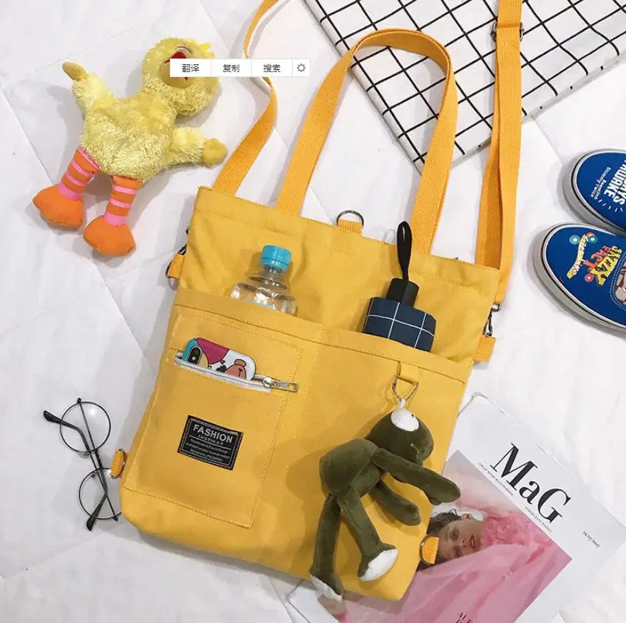 Canvas Women's Handbag Shoulder Tote – Large Capacity Folding Shopping Bag with Frog Pendant