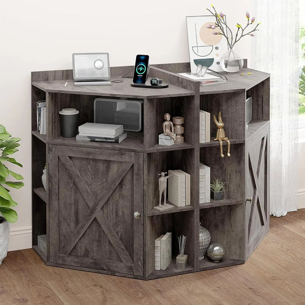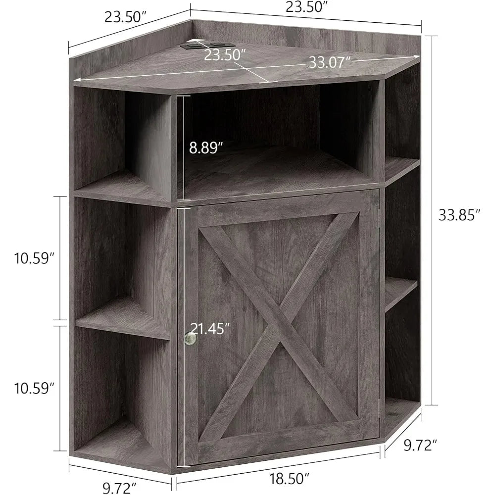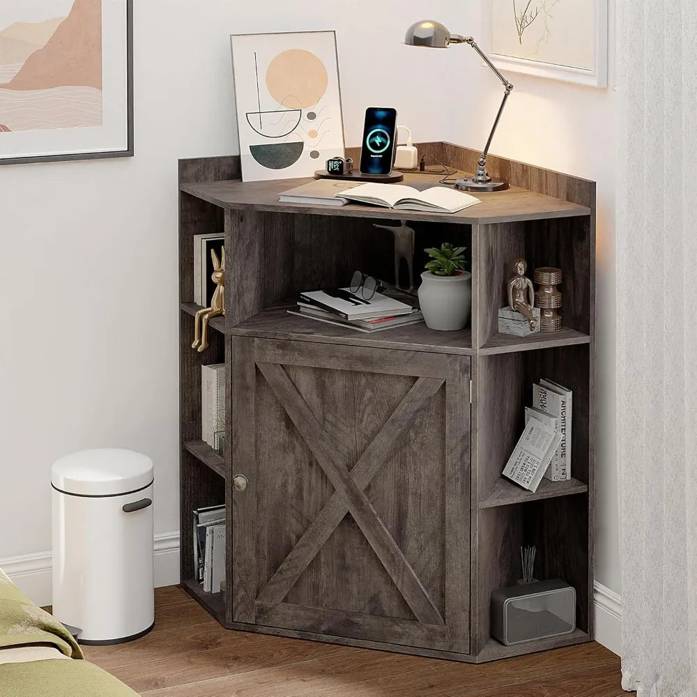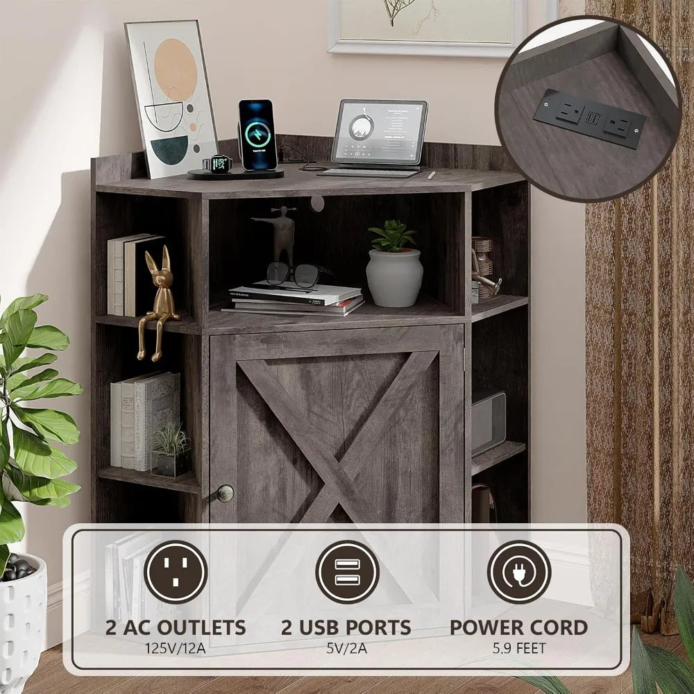 Corner Cabinet with USB Ports & Outlets – Industrial Wooden Storage Shelf for Small Spaces