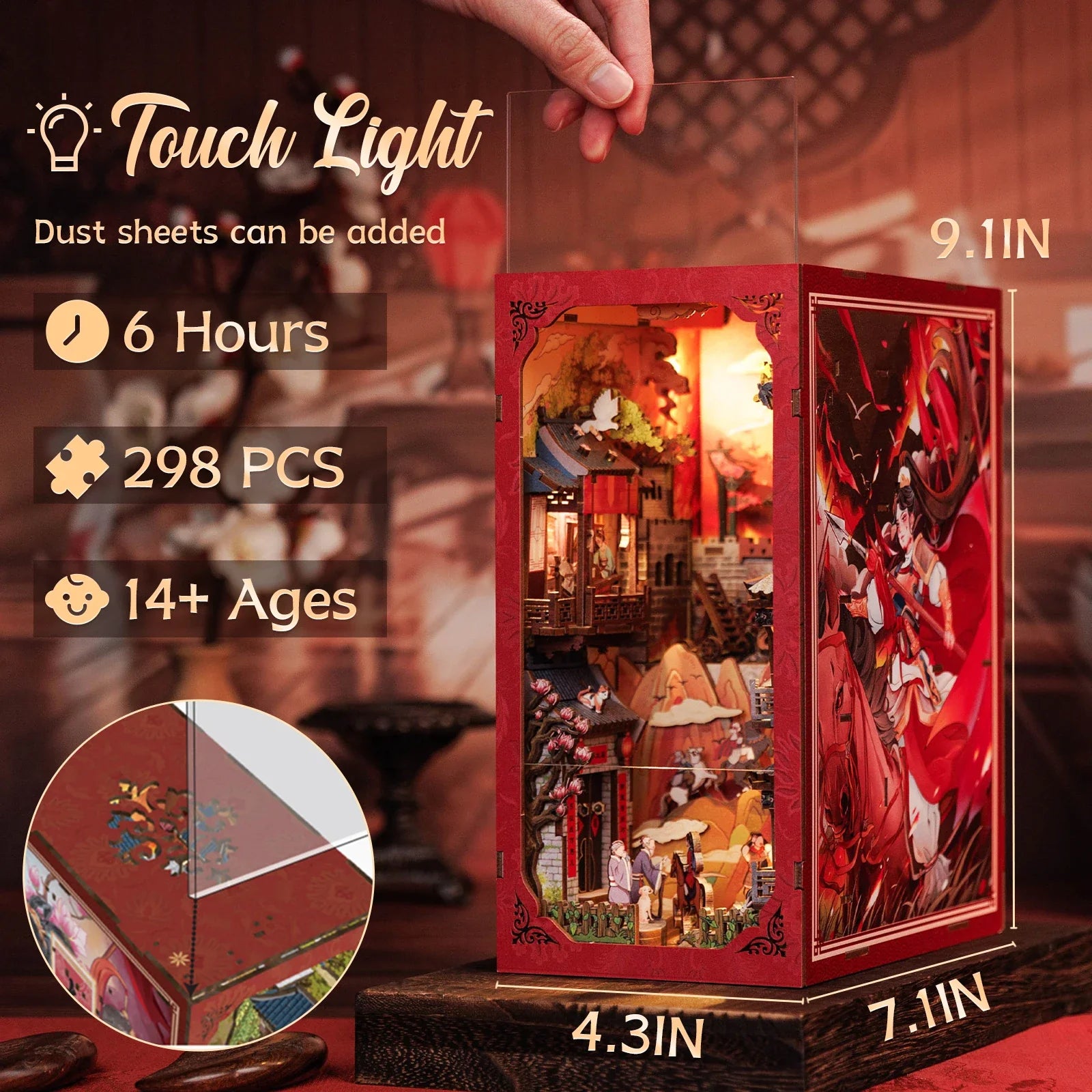 Precision-cut wood, paper, resin accessories, acrylic dust cover, and built-in LED lighting.
