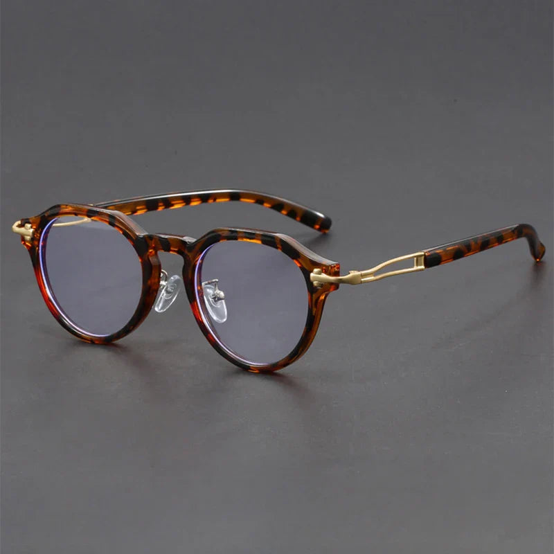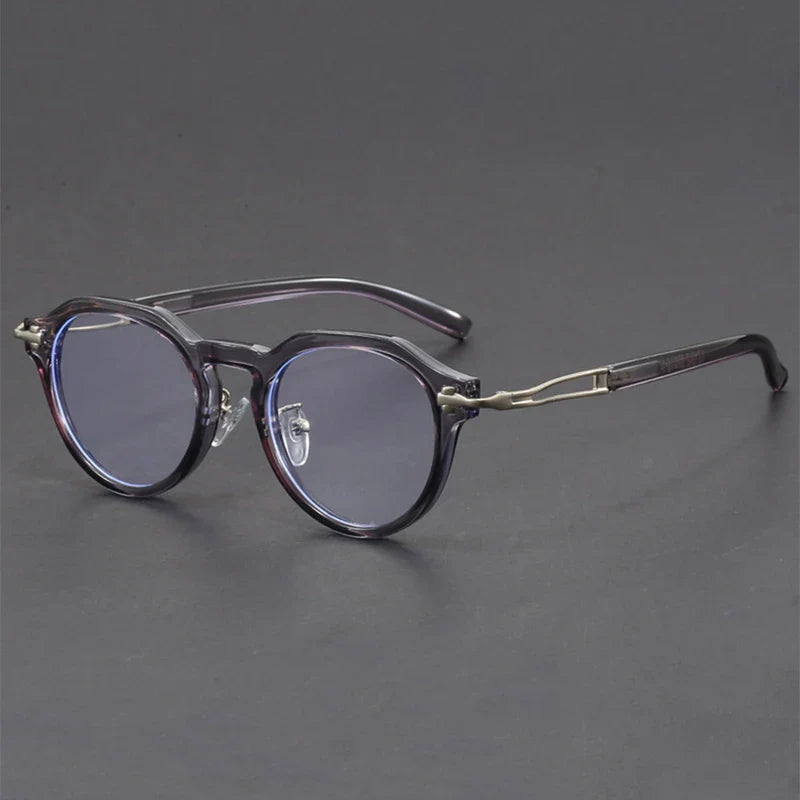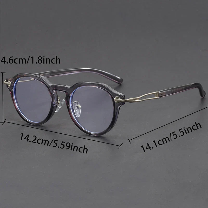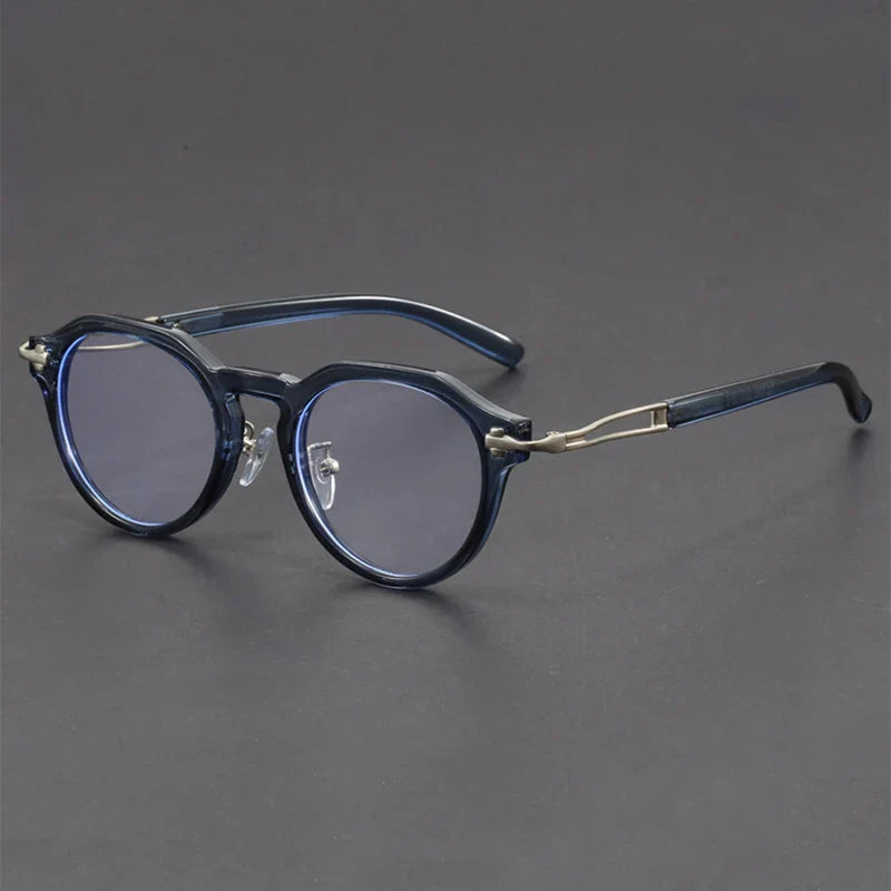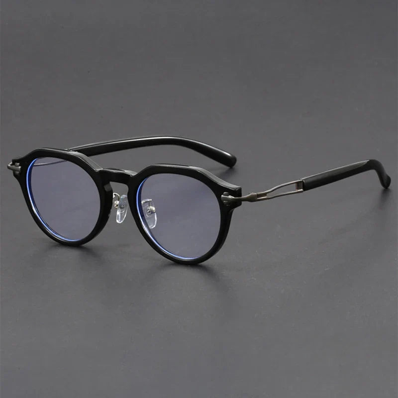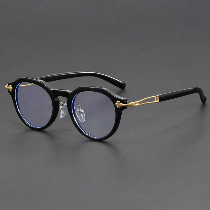 Premium metal and acetate blend frame with anti-blue light optical lenses.