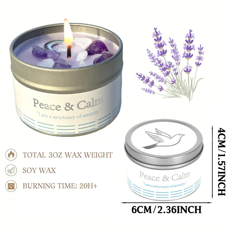 100% natural soy wax, infused crystals, and aromatherapy-grade essential oils in a 3oz glass jar.