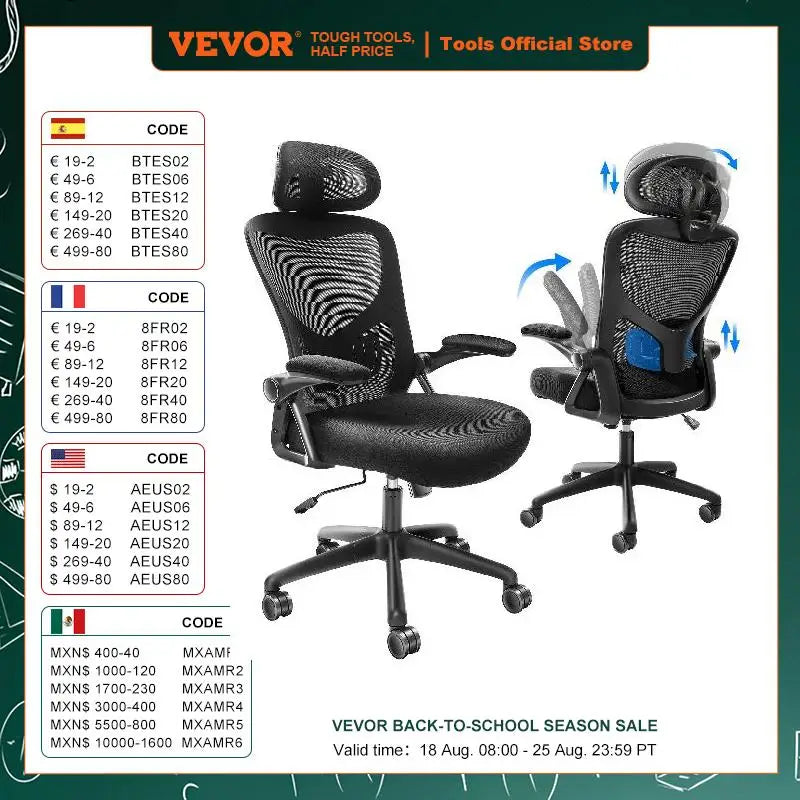 Work smarter and sit comfortably with the VEVOR Ergonomic Office Chair — designed with a sliding mesh seat, adjustable lumbar support, and customizable angles to support your posture all day long.